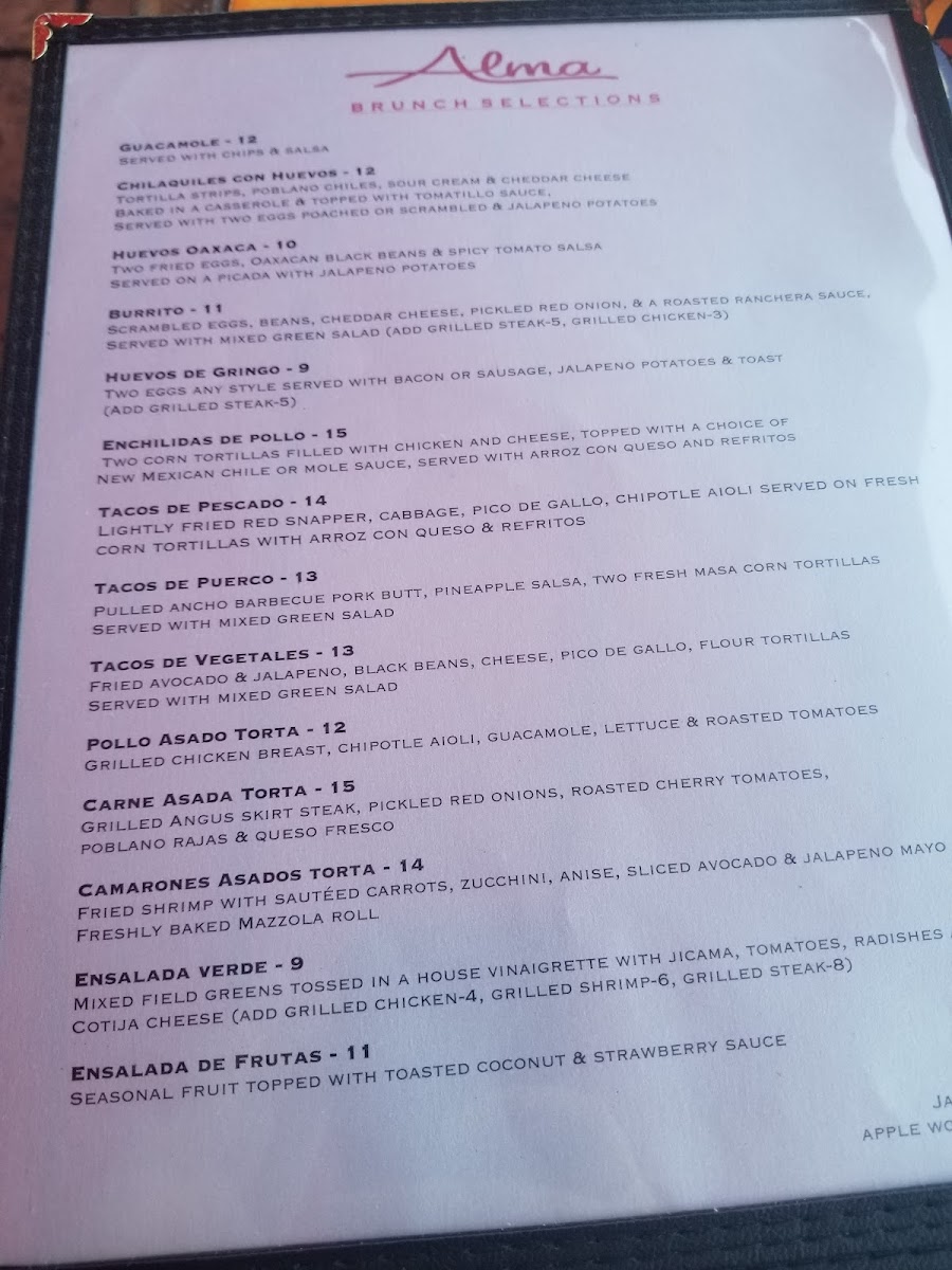 Flour tortilla, grilled chicken, scrambled eggs, black beans, cheddar cheese, sour cream, guacamole, Alma's Ranchera Sauce